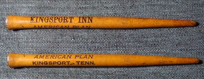 I rescued this pen staff (it’s just one; I rotated it so you could see the whole graphic on the staff) as the Kingsport Inn was being demolished. A buddy and I, we both lived downtown, went over one evening to explore the building. It was partially razed, but the lobby and some of the rooms were still accessible. There was no security that we saw. We wandered around and looked at stuff. I remember finding a room rate card, but it’s been lost in one of many transitions.