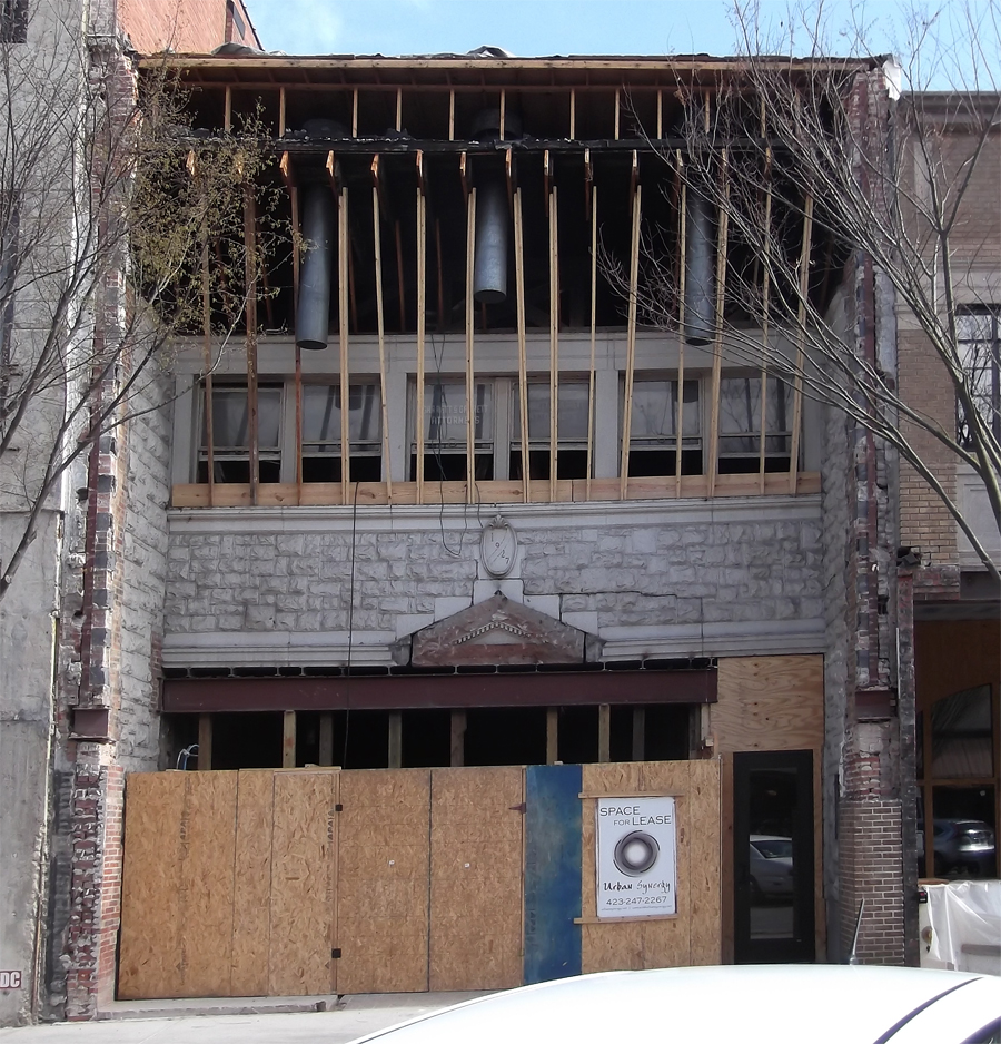 There was a building boom on Broad Street in 1927 and both Kingsport National Bank and this, The Farmers and Merchants Bank, opened up around June of that year. In 1945, it became Sullivan County Bank. At some later date, it was home to Harris & Graves Insurance. By 1959, it was the Moore & Walker Insurance building.