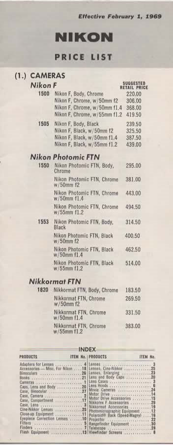 Look at those prices, which I thought were sky high even then. This is just the cover. The leaflet goes on to price lenses, camera bags, medical lenses, viewfinders, photomicrographic lenses and so forth. Prices range from a high of $895 for a 220 degree Nikkor fisheye (f5.6) to fifty cents for a plastic case for a 52mm filter. The plastic body cap ran you $1.35.
