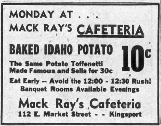 This is from the Kingsport Times-News 02/27/1955. J. Mack Ray (1910 -1968) was from Cocke County. He moved to Kingsport to start this restaurant.