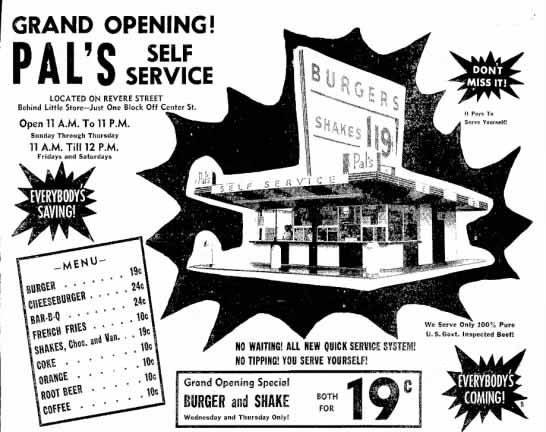 As I’ve noted before, my Kingsport Times paper route took me down Shelby Street, behind the Post Office (it became the library in ’61). The tempting smells coming from Pal’s made my stomach rumble. Still does, even today.