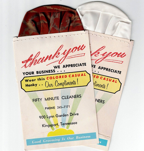 “50” Minute Cleaners or Fifty Minute Cleaners, 900 Lynn Garden Drive (it’s now the low, red-roofed building next to the log house). As far as I can tell from available sources, it was in business from the late 60s to the very early 70s. It faced heavy competition from One Hour Martinizing with seven locations around town. These are fake poufs for the left outpocket on a sport coat. You could also, I suppose, stash one in the back pocket of your jeans…