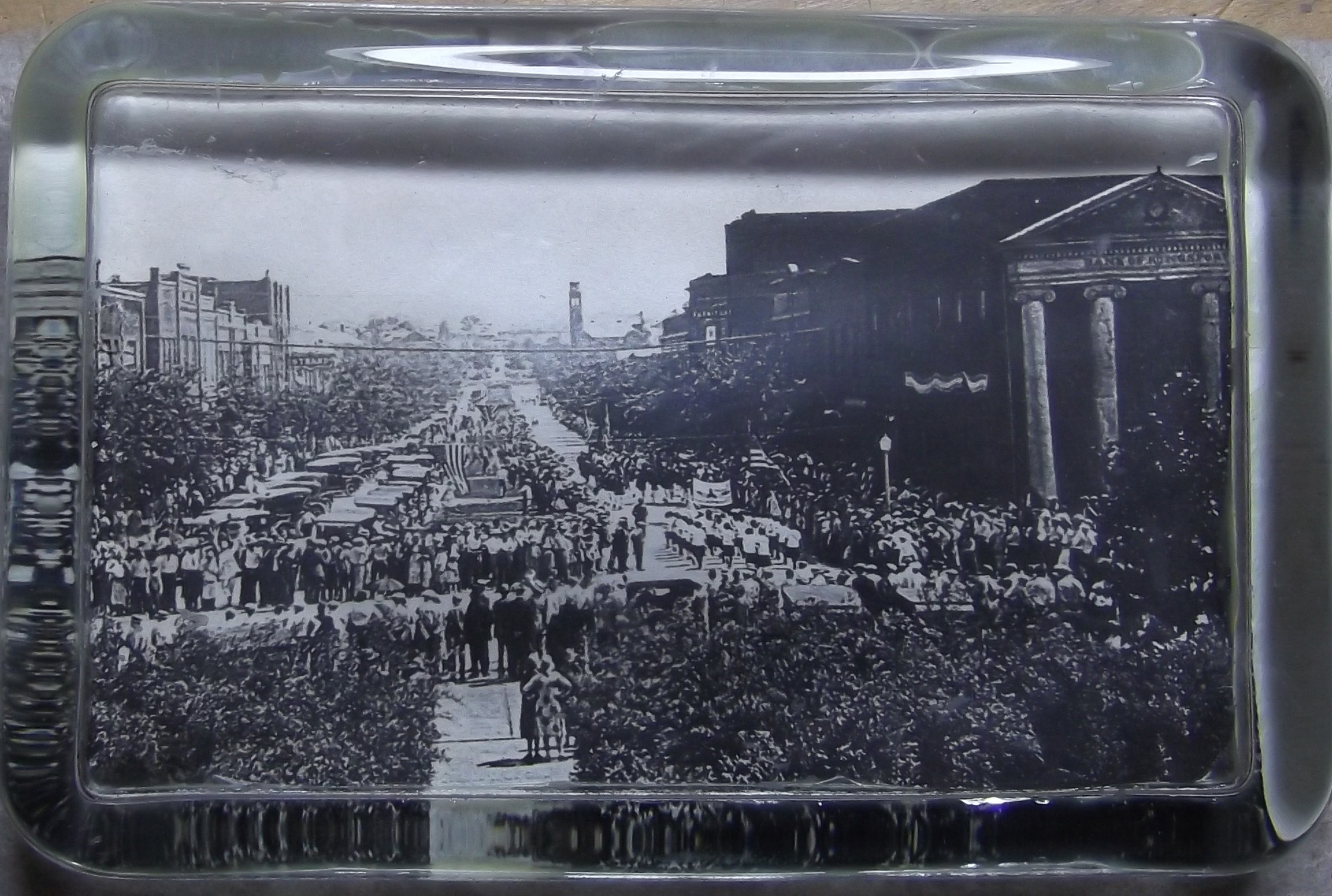 This is a solid glass paperweight 2.75 x 4.25 x .75. It is recessed on the back so a photo or other flat memorabilia can be pressed in. In this case, it is a black and white photo, taken from the train station clock tower, of a festive, patriotic event in the 1920s in downtown Kingsport. My guess is some July 4th celebration. Btw, these molded glass paperweights may still be purchased. Check Behrenberg Glass website.